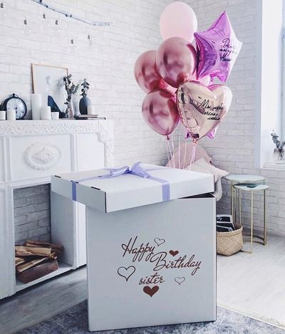 Можно нанести любую надпись на ваше усмотрение как на коробку, так и на шары. Заказ на индивидуальный текст принимается за 3 РАБОЧИХ дня.