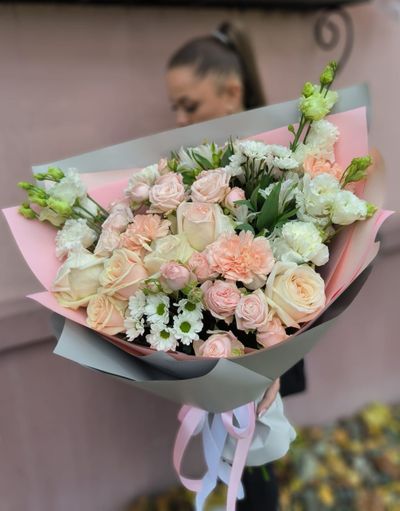 Вы можете внести изменения в композицию (изменить цветовую гамму букета, определенные детали, упаковку, добавить ваши любимые цветы и т.п.). Ваш букет будет собран из свежих, сезонных цветов.