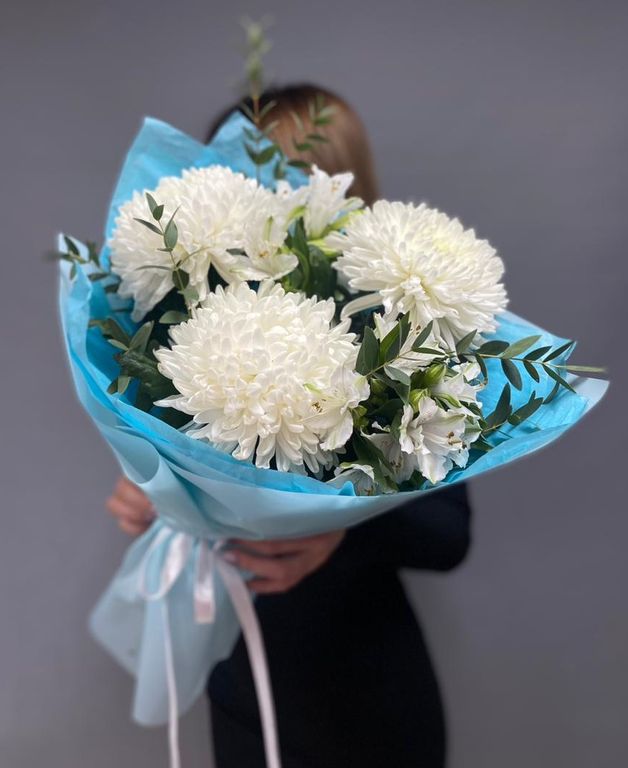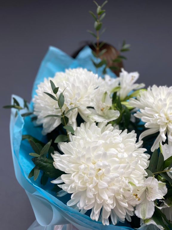 Букет белых хризантем "Голубая лагуна"