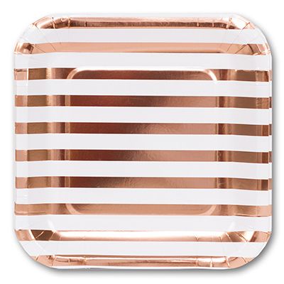 Нарядные бумажные тарелки с полосками цвета розового золота. Универсальны, подходит для любого праздничного фуршета. Выглядят стильн о, нарядно и ярко. В наборе 6 тарелок размером 17 см. Купить красивую одноразовую посуду оптом можно на нашем сайте.