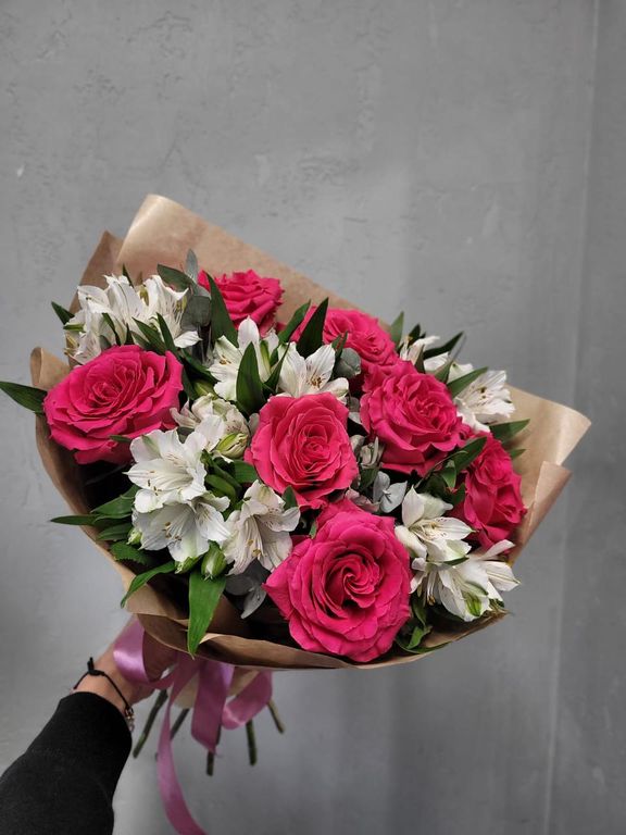 Добавить в избранное Убрать из избранного Букет малиновых роз и белой альстромерии "Вечная любовь" 3 760 ₽ В корзину В корзину Состав: Роза одноголовая - 7 шт Альстромерия - 5 шт Эвкалипт - 1 шт Упаковка - 1 шт Лента - 1 шт Состав: Роза одноголовая - 7 шт Альстромерия - 5 шт Эвкалипт - 1 шт Упаковка - 1 шт Лента - 1 шт